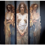 Die Hauptfigur ist in den Werken meist präzise und detailliert ausgearbeitet, was ihre physische Präsenz und emotionale Tiefe betonen soll. Im Kontrast dazu stehen die schemenhaften, fast ätherischen Gestalten an den Seiten, die verschwommen oder stilisiert dargestellt sind. Diese Gegenüberstellung verstärkt das Gefühl von innerer Zerrissenheit und symbolisiert die Suche nach dem Selbstverständnis.