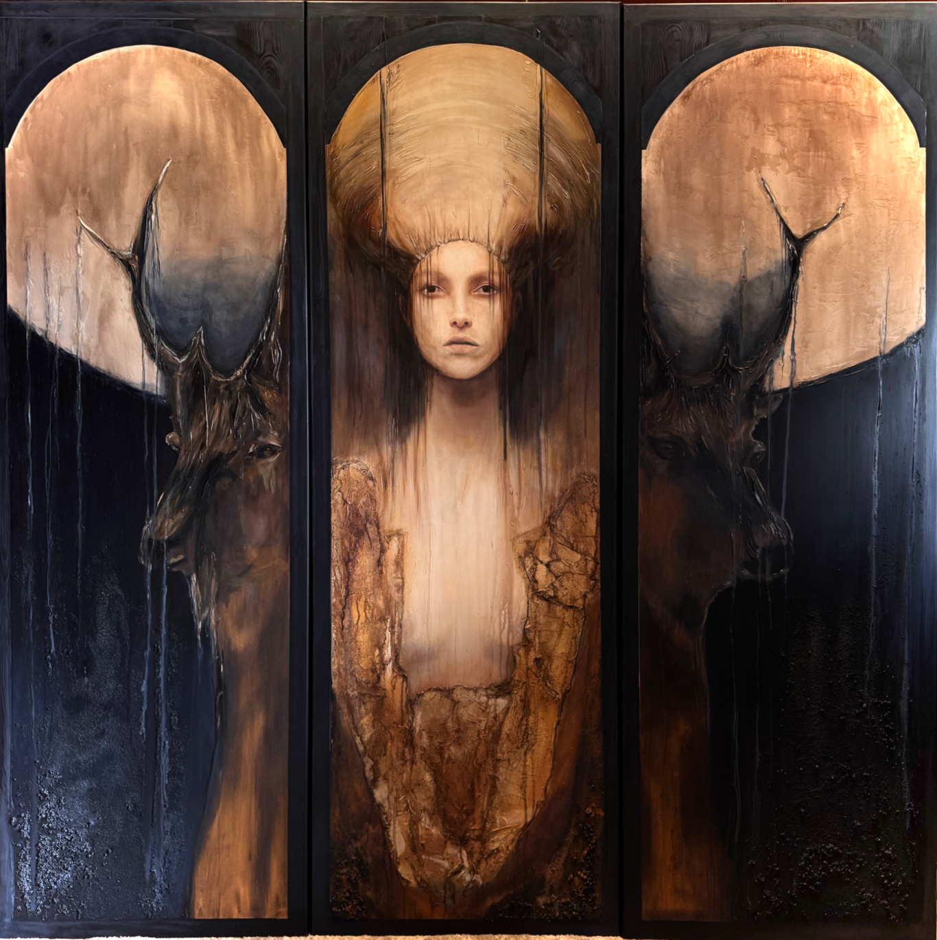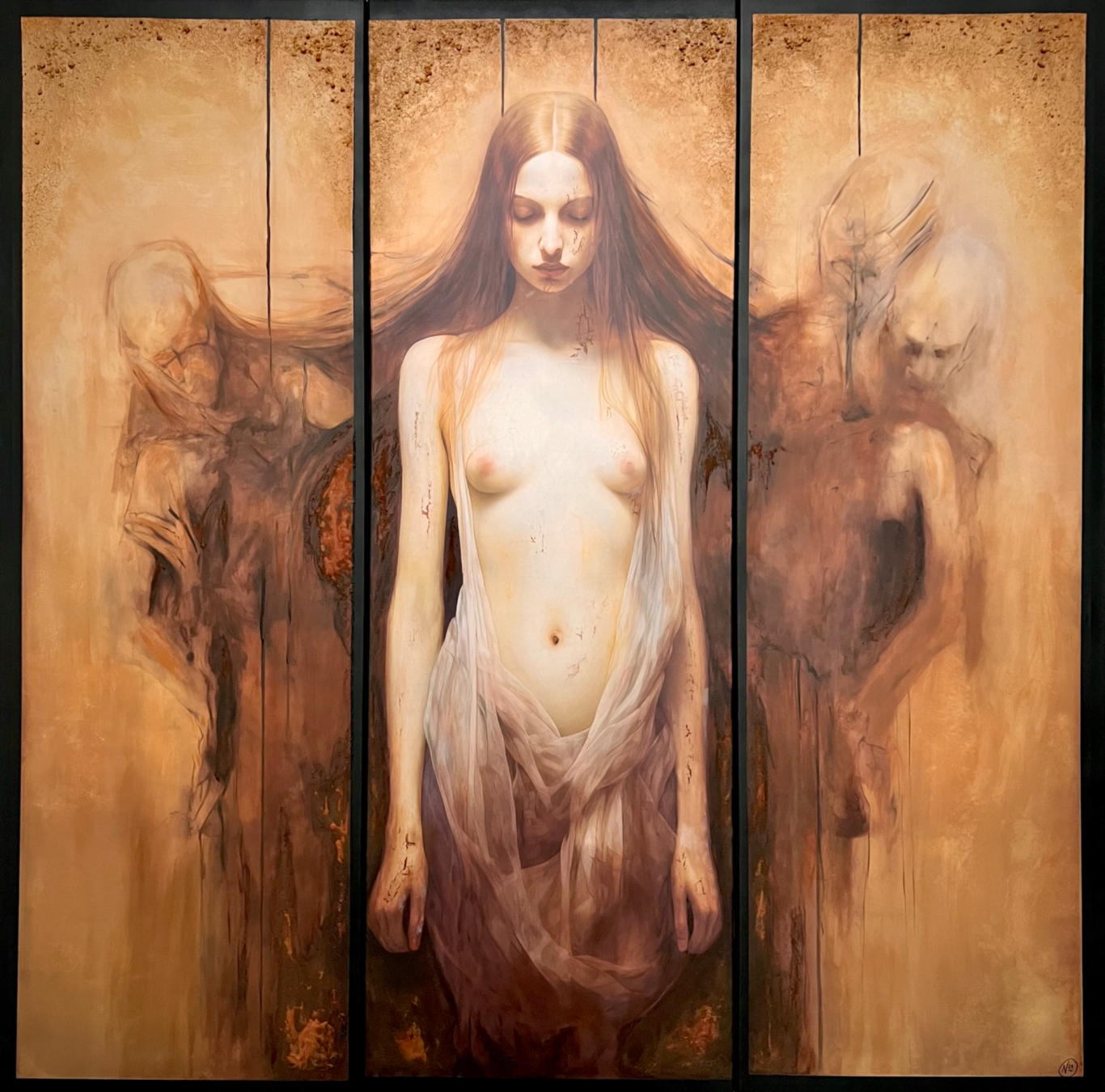 Die Hauptfigur ist in den Werken meist präzise und detailliert ausgearbeitet, was ihre physische Präsenz und emotionale Tiefe betonen soll. Im Kontrast dazu stehen die schemenhaften, fast ätherischen Gestalten an den Seiten, die verschwommen oder stilisiert dargestellt sind. Diese Gegenüberstellung verstärkt das Gefühl von innerer Zerrissenheit und symbolisiert die Suche nach dem Selbstverständnis.